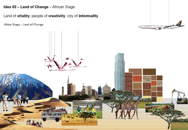 Für die Weltexpo 2010 wurde das Atelier Brückner angefragt, den African Joint Pavillon zu gestalten. Neben einem Konzept für den kompletten Innenraum mit individuellen Länderzonen und einem zentralen Showelement, sollte auch die Fassade des monolithischen Gebäudes bespielt werden. Unterschiedliche Bespielungsvarianten und Animationen wurden hierfür entwickelt.