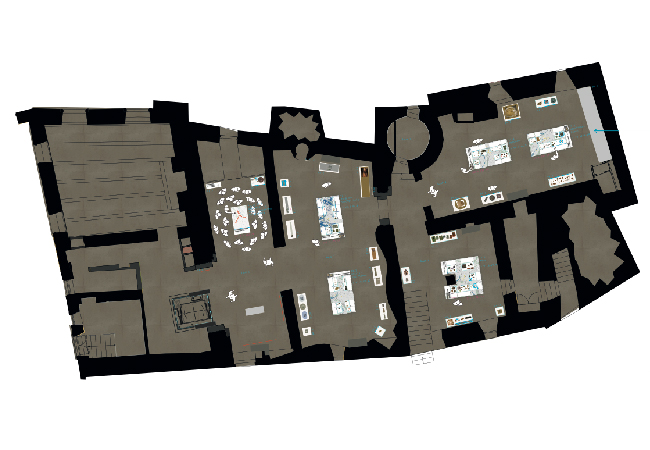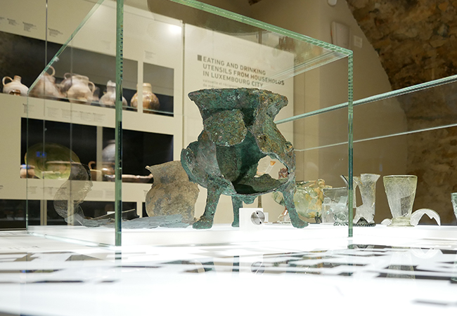 Der Großteil der Exponate aus dem Mittelalter sind „Latrinenfunde“ aus dem Gebiet der Stadt Luxemburg – Artefakte die entweder bewusst oder unbewusst entsorgt wurden. Um diesem „Abfall der Geschichte“ neuen Glanz einzuhauchen, sind die Exponate entsprechend einer »Bijouterie« in den historischen Kellergewölben präsentiert: den einzelnen Objekten Raum gebend, reduziert, leuchtend.