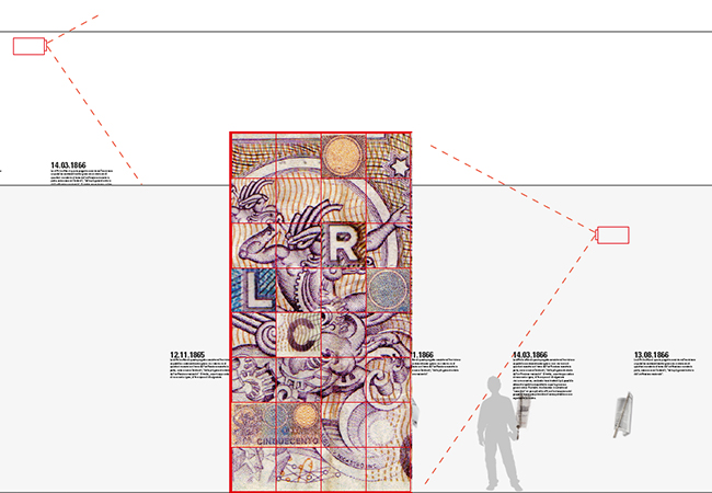 „Aus Anlass der 150-jährigen Staatsgründung zeigt die italienische Zentralbank Banca d´Italia die glanzvolle Jubiliäumsschau „La moneta dell` Italia unita“. Die Präsentation wertvoller Münzen, Banknoten und historischer Dokumente spricht nicht nur ein Fachpublikum an, sondern eröffnet auch einen emotionalen Zugang zur monetären Vereinigung Italiens. Italienische Geschichte tritt mittels szenografisch durchdachtem Setting in den Raum. Es bietet dem Besucher zum einen ein kollektives Erlebnis, das über Content-generierte, multimediale Raumbilder und Rauminstallationen vermittelt wird; zum anderen taucht der Besucher individuell-spielerisch an einzelnen, im Raumbild integrierten Medienstationen in spezifische Inhalte ein.“ (atb)