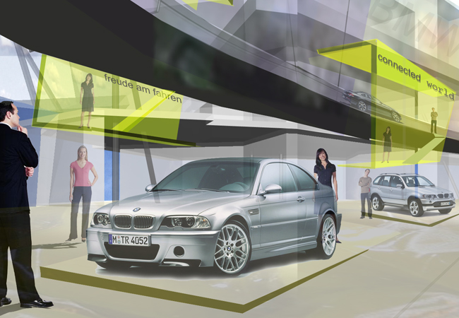 In einem geladenen Wettbewerb entwickelte Dirk Schubert im Wettbewerbsteam im Atelier Brückner ein Raum- und Ausstellungskonzept für das neue BMW Auslieferungszentrum gegenüber dem BMW Museum. Aufgabenstellung war es, innerhalb der offenen Architektur Markenflächen zu definieren und zu inszenieren. Grundidee des Entwurfs war es, eine starke medial-räumliche Geste zu schaffen, welche die drei Einheiten „Produktion“, „Auslieferung“ und „Museum“ über dynamische Brücke miteinander verbindet.