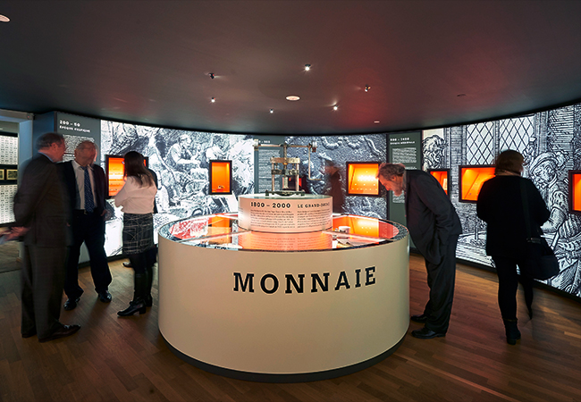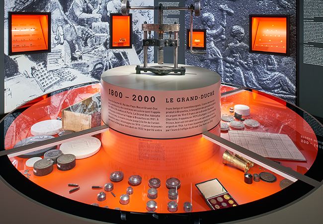Der Parcours lädt dazu ein, die verschiedenen Themen der Numismatik zu entdecken: Schatzfunde, bedeutende Sammlungen, Münzikonographie, Herstellungswerkzeuge und Prägung, Wechselgeld und Banknoten, Medaillen und Orden. Die heutige Sammlung von über 200.000 Stücken besteht hauptsächlich aus Münzen, die im luxemburgischen Gebiet von der Antike bis zum Euro im Umlauf waren und verbirgt ebenfalls einige außergewöhnliche Ausstellungsstücke, wie Barren oder Hohe Orden.