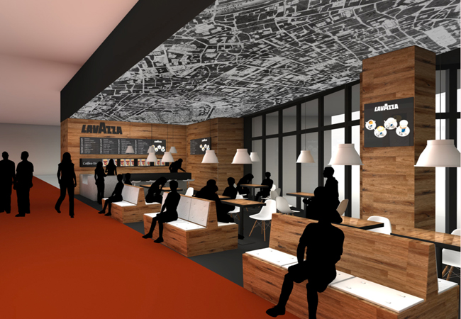 Für den Outlet Carhartt Store in Weil am Rhein hat das Atelier Schubert im Auftag von Planquadrat ein neues Gestaltungskonzept für das bestehende Café entwickelt. Maßgebend ist in dem neuen Konzept vor allem die urbane Deckengrafik, welche den hohen industriellen Bestandsraum ausblendet und die Caféfläche fasst.
