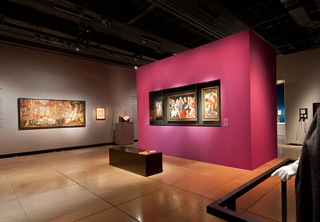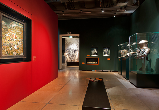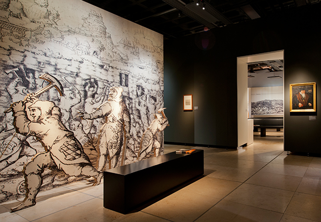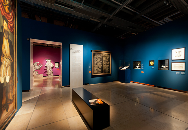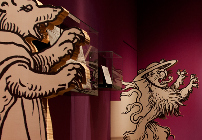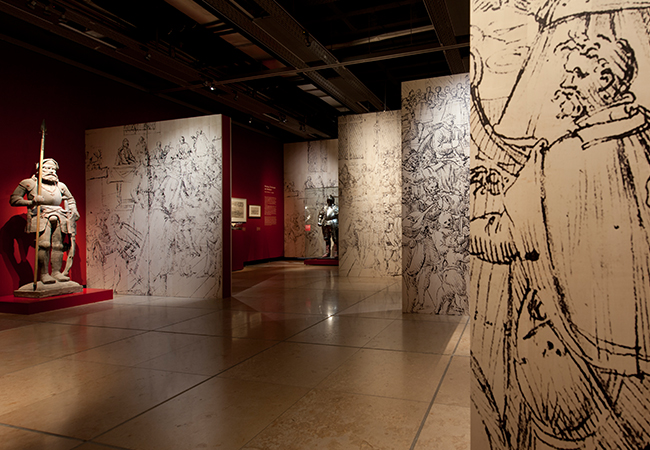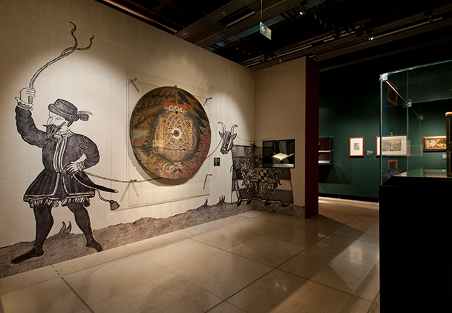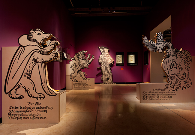 Grundidee der Gestaltung war eine räumliche Inszenierung der thematischen Motive und Bildthemen aus dem sehr illustrativen Buchdrucks der damaligen Zeit. Somit ergeben sich zwei unterschiedliche Erzähl- und Darstellungsebenen in der Ausstellung. Ein eher grafisches, stark visuelles Raumbild und eine eher museale, zurückhaltendere Präsentation der Exponate und deren Inhalte. Zentrale Botschaften werden in der Mitte und Unterthemen in der Peripherie des jeweiligen Raumes thematisiert.