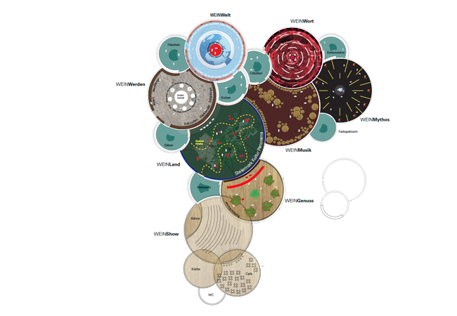 Konzept für ein Event- und Ausstellungszentrum in Östereich über das Thema Weinanbau in der Steiermark. Der Neubau sollte als touristisches Zentrum einer Weinbaugenossenschaft geschaffen werden und neben einer Verköstigung auch die Geschichte des regionalen Weinanbaus erzählen. Es sollte eine erlebnisreiche Ausstellung entwickelt werden.
