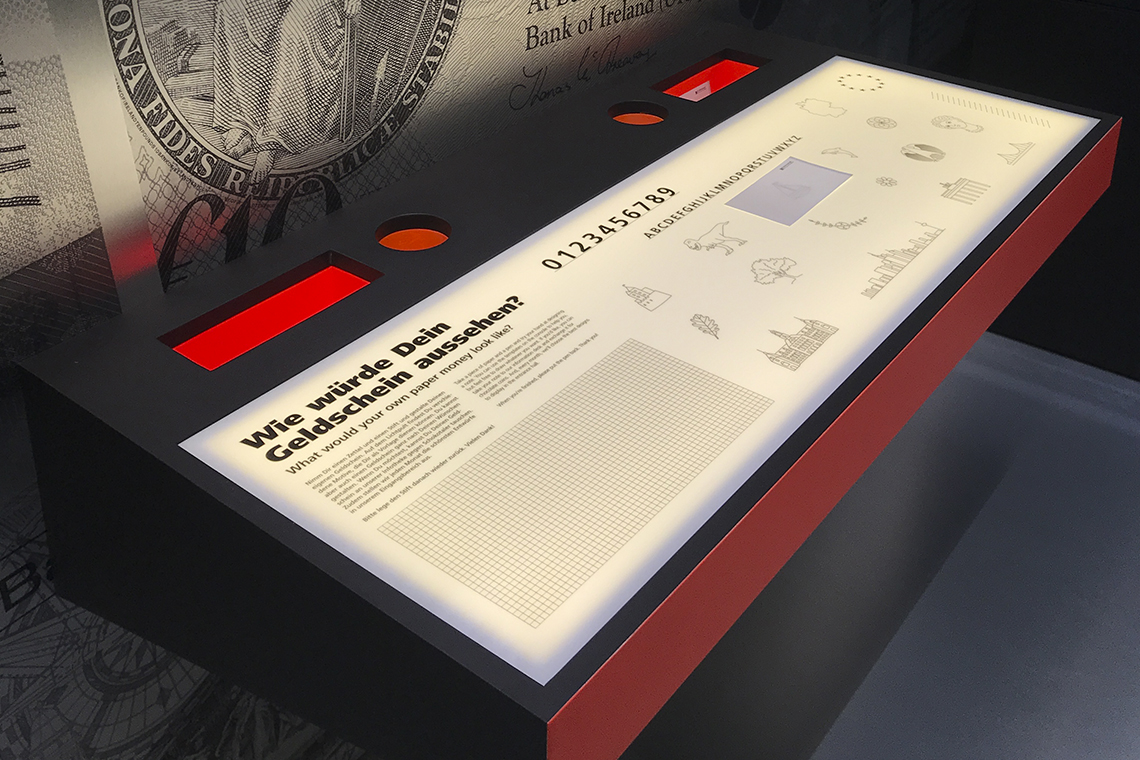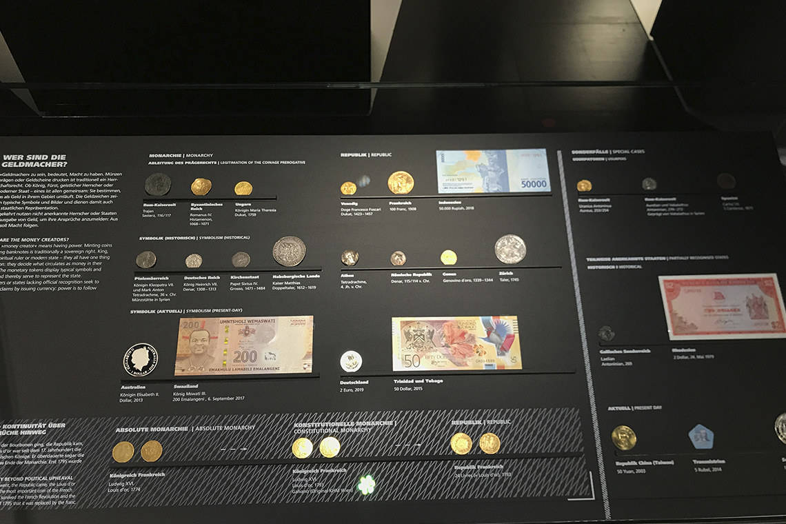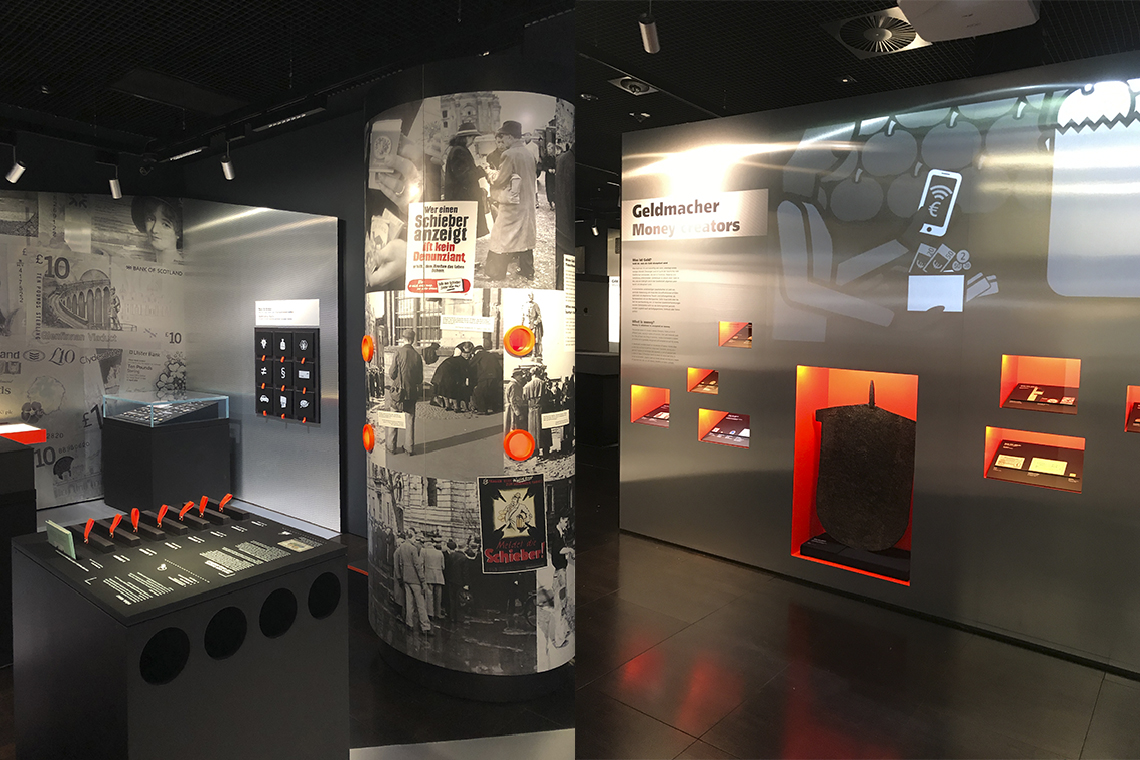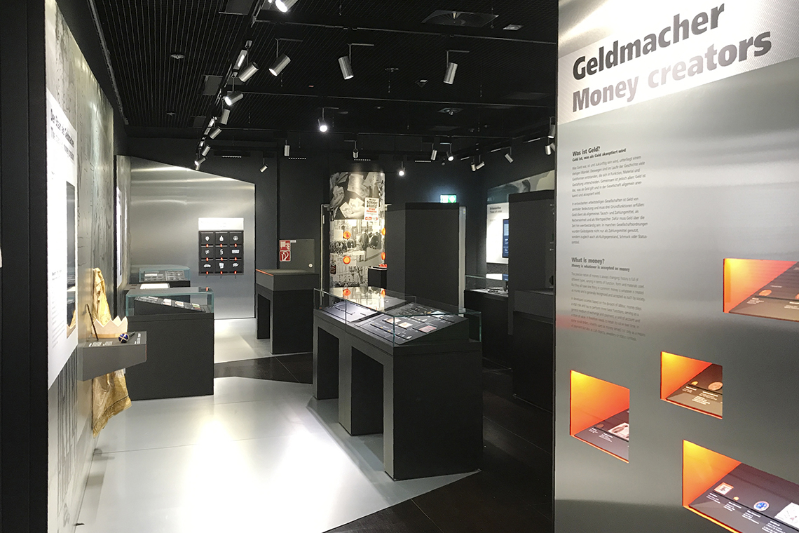 Wer bestimmt, was Geld ist?“. An sechs Stationen können Besucherinnen und Besucher mehr über die zentralen Personen und Institutionen erfahren, die als Geldmacher entscheiden, was als Geld gilt. Geld habe sich in seiner Erscheinungsform immer wieder gewandelt und mit ihm die Personen und Institutionen, die Geld machen, sagte das für Bargeld zuständige Bundesbank-Vorstandsmitglied Johannes Beermann anlässlich der Eröffnung. „Doch es gibt einen roten Faden, der sich durch die Geschichte der Geldmacher hindurchzieht: Um als Emittent von Geld dauerhaft zu bestehen, benötigt er vor allem das Vertrauen der Bevölkerung, also von denjenigen, die das Geld täglich nutzen sollen“, erläuterte er. Diesen roten Faden greift auch die Ausstellung auf und geht der Frage nach: Wer bestimmt eigentlich, was Geld ist? Die wesentlichen Geldfunktionen werden in der Sonderausstellung ebenso erklärt wie die Rolle des Staates als traditionell wichtigstem Emittenten von Geld. Besucherinnen und Besucher erfahren darüber hinaus, wie Menschen Notgeld oder Ersatzwährungen nutzten, wenn der Staat in Krisenzeiten daran scheiterte, den Geldverkehr funktionsfähig oder den Geldwert stabil zu halten. Die Ausstellungsgestaltung arbeitet mit einem starken Kontrasten in der Materialität der Ausstellung. Die sechs Themeninseln werden sind in »harter« Währung in einer Metalloberfläche mit bedruckter Großgrafik umgesetzt. Alle analogen und mediale Hands-On Stationen (zwei pro Insel) für den Besucher wurden mit einer leuchtenden Signalfarbe umgesetzt. Die gesamte Ausstellung ist auch virtuell online über 360° Bilder und Links zu begehen.
