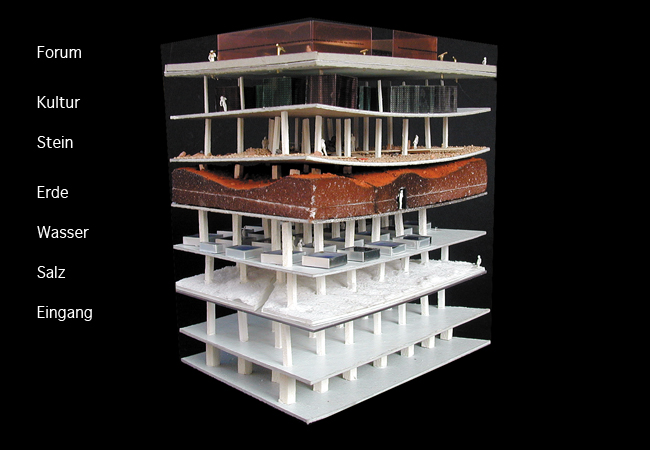 Gutachten. Auf der Neckarinsel in Heilbronn soll ein altes Lagergebäude einer neuen kulturellen Nutzung zugeführt werden, und somit Pilotfunktion für die Entwicklung der Insel als kulturell genutzter Ort haben. Das Gutachten sieht die Zusammenführung der städtischen Museen für Schifffahrt, Kunst und Archäologie zu einem Museum der Ressourcen vor, das durch seine vertikale Gliederung an einen geologischen Schnitt der Region erinnert.