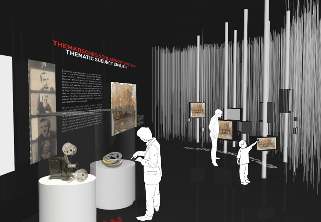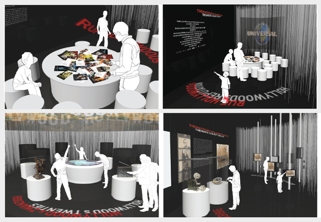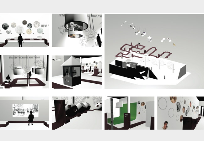 Ziel des Kurses war es, die den Raum beeinflussenden gestalterischen Parameter zu untersuchen und sie für eine wirksame Informationsvermittlung im Raum einzusetzen. Der medienübergreifende Konzeptansatz spielt hier eine zentrale Rolle. Die Projektarbeit bat die Möglichkeit, die eigene gestalterische Kompetenz im Bereich Ausstellungsgestaltung / Information im Raum zu schulen und sich bewusst mit einer gestalterischen Problematik im Raum auseinander zu setzen. Projektthema: Konzeption einer temporären Ausstellung im Haus der Geschichte in Stuttgart über die 100-jährige Filmgeschichte Hollywoods und dessen schwäbischen Gründer Karl Lämmle (Carl Laemmle) aus Laupheim.