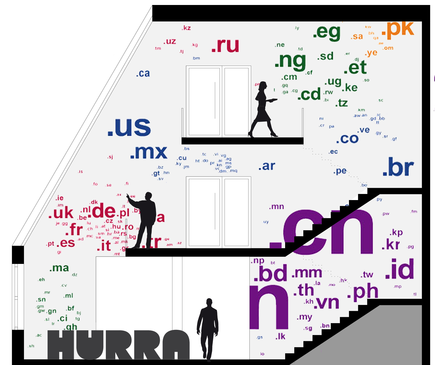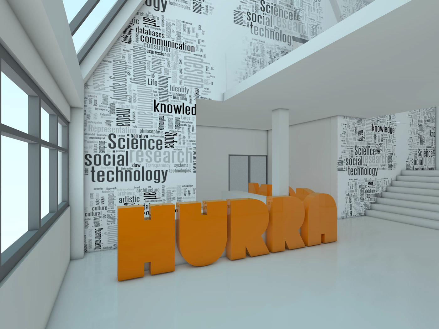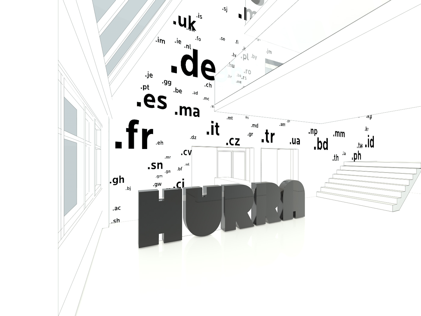 Im Rahmen der Entwicklung eines neuen CI/CD für die online performance Agentur Hurra. com entwickelte das Atelier Schubert im Auftrag der CI Agentur STRICHPUNKT erste Ideen für eine Corporate Architectur. Aufgabenstellung war es in einem ersten Schritt den Eingangsbereich und das Treppenhaus für Mitarbeiter und Kunden mit dem neuen CI/CD zu bespielen. Neben dem extrudierten LOGO gab es die Idee den Luftraum grafisch mit einer spezifischen „Tag-Cloud“ oder einer abstrakten Weltkarte mit den über 200 Top-Level_Domains zu bespielen.