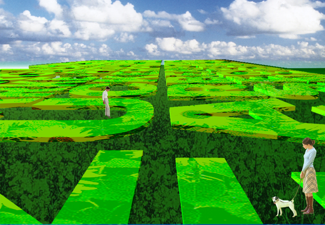 Wettbewerb für einen Pavillon des BMVEL auf der IGA 2003 und BUGA 2005. Der Gedanke der Nachhaltigkeit wird im Rahmen der Gestaltung der Außenanlagen durch Felder mit streng orthogonalen Ausrichtung dargestellt (domestizierte Natur). Eine spiralförmig gebogene Rampe, die den Besucher in einer konzentrischen Bewegung zum Pavillon führt, versinnbildlicht dagegen das harmonische Miteinander von Mensch und Natur. An mehreren Aussichtstürmen entlang der Rampe konnte der Besucher weitere Informationen zu dem domestizierten Feld über digitale Ferngläser bekommen.