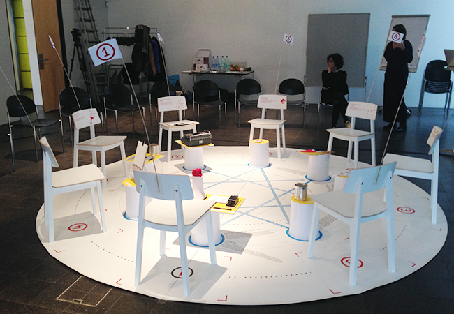 Aufgabenstellung war es, eine „Kommunikationsstation“ zu entwickeln. Leitidee der Installation war eine übersetzte Kommunikationsplattform welche unterschiedliche Themen, Objekte und Ereignisse durch die Zeit in einem interaktiven Spiel mit unterschiedlichen Medien miteinander verknüpfte.