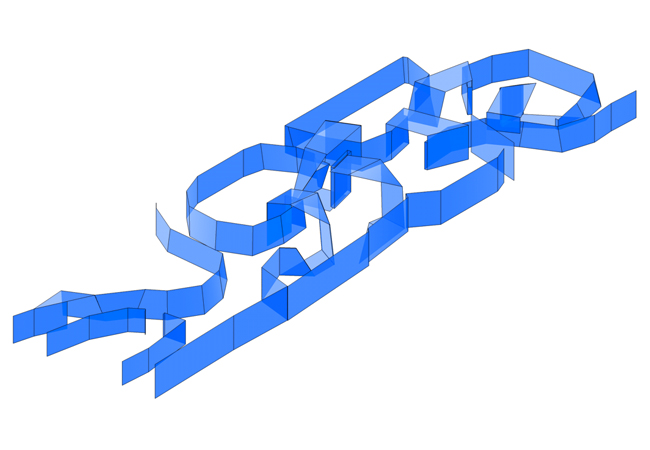 Die Idee war, die unterschiedlichen Produktwelten von Panasonic in einer integrativen großen Geste zusammenzubringen um so Firmenidentität zu zeigen. Aus den Produkt-Ressourcen der Firma entwickelt, entstand ein über 300 m langes Möbiusband, das gänzlich mit Projektionen bespielt wurde. 52 Beamer aus firmeneigener Produktion demonstrieren dabei eindrucksvoll gleichzeitig Kompetenz und Leistungsfähigkeit der Produkte. Architektur kann in Bewegung geraten, Architektur aus Film lässt den Film wiederum selbst zum begehbaren Sujet werden.