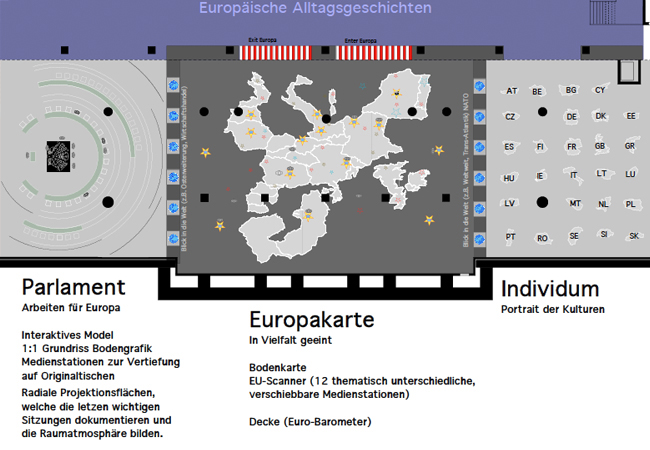 Sämtliche Inhalte sind in 23 Sprachen aufbereitet und können somit von jedem EU-Bürger in seiner Muttersprache abgerufen werden. Das Herzstück der Ausstellung ist der Raum „United in Diversity“, er übersetzt das Motto der Europäischen Union in ein dreidimensionales, begehbares Sujet.