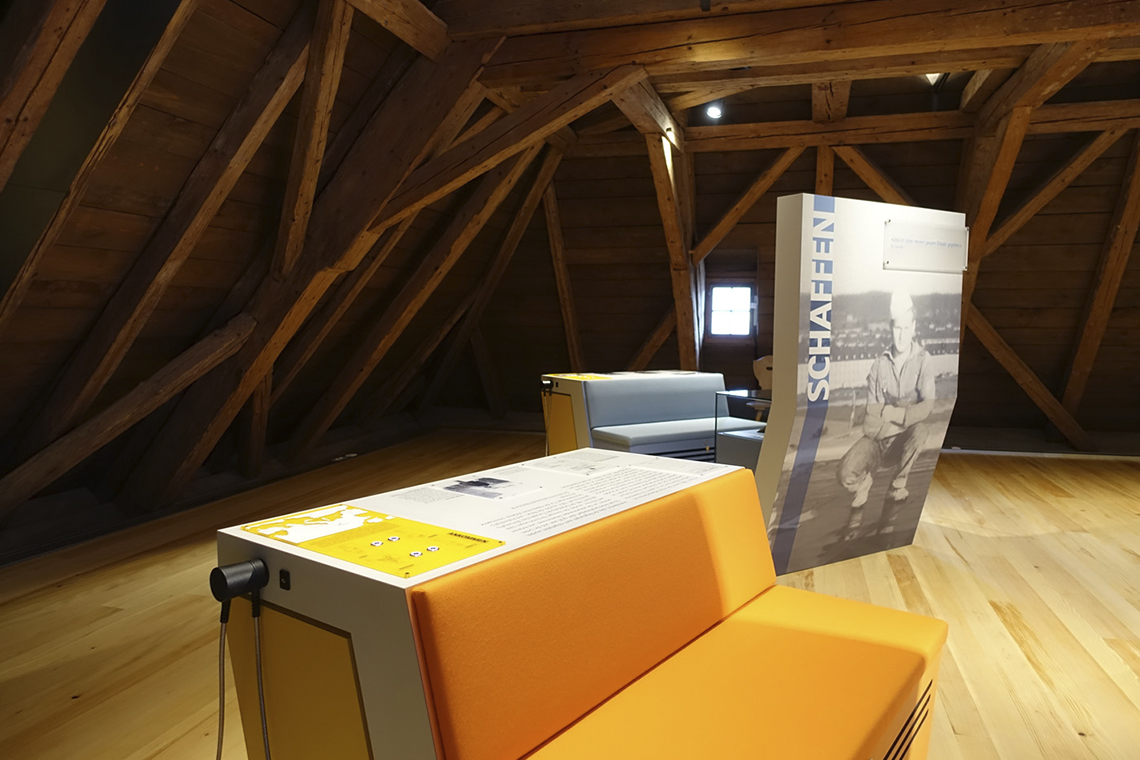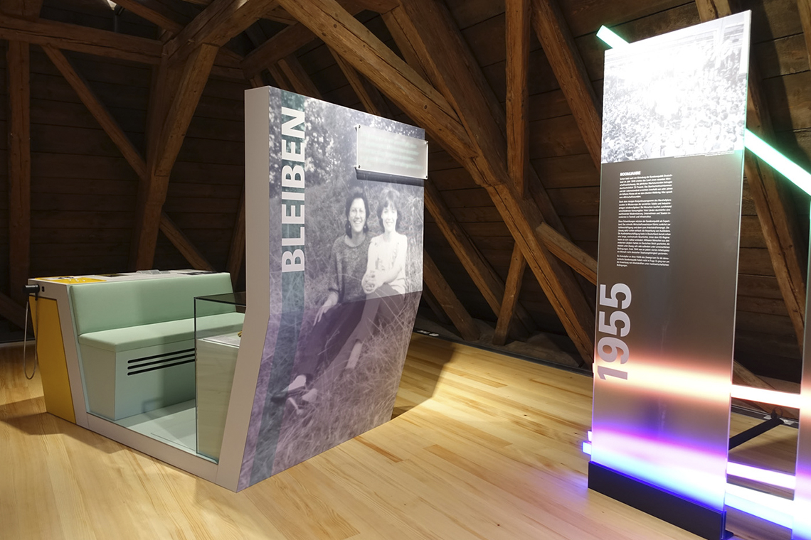 Nehmen Sie Platz in einem von sieben „Zeitvehikeln“ und begeben Sie sich auf die Reise – wie live und in Farbe erzählen dort die Zeitzeug/innen. Sie oder ihre Eltern waren vor rund 60 Jahren gekommen, um zu „schaffen“, denn die Wirtschaft im Landkreis Ravensburg florierte. Ein Aktenschrank-Imitat zeigt die bunte Unternehmenslandschaft der 1950er bis 1970er Jahren in vielen Branchen. Im interaktiven Landkreis-Relief wird die damalige industrielle Arbeitswelt auf dem Land lebendig.
